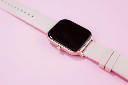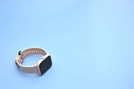 Smart bracelet on pink blue pastel background. Modern gadgets. top view. minimalism
