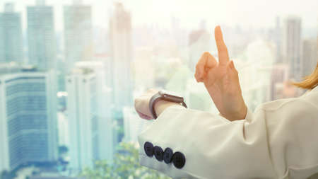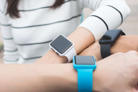 Woman wearing intelligent health watch on her wrist. Close up view.