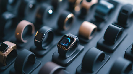 Close-up of stylish wearable technology gadgets like smart rings and fitness bands, showcasing their sleek designs and advanced health tracking features for users.