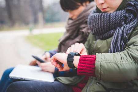 Blond girl with headphones looking at smartwatch on her left wrist among friends