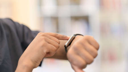 A man with a smartwatch and a white screen mockup on his hand. A man uses a fitness tracker on the background of a shopping mall