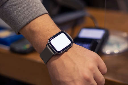 Wireless online payment. A mockup of a smart watch with a white screen on a man's hand against the background of terminal for payments
