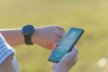 Young Woman using wearable watch connecting to mobile phone