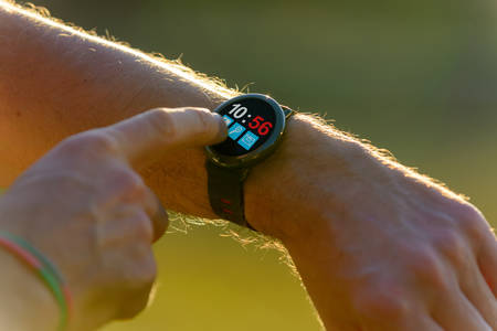 Hand using app monitor for run and looking at smartwatch