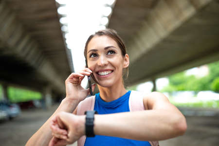 Smiling young woman using cell phone and smart watch after exercise. Portrait of athlete standing in parking lot under bridge.