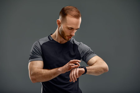Pleased unshaven guy looking at wristwatch while working out on promenade