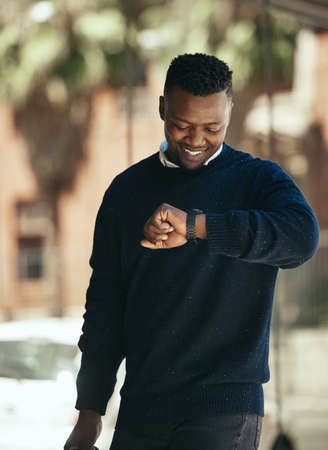 Business man, park and watch timer for return commute to office. Happy corporate employee checking time outside in the city. Smiling working person outdoors with isolated background in town