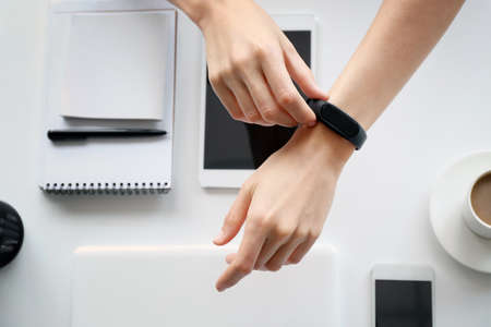 Woman using fitness tracker at table, top view