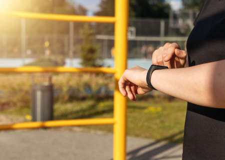 Faceless woman checking fitness and health tracking wearable device on her hand, unknown female in white top posing outdoor in stadium on sunset.