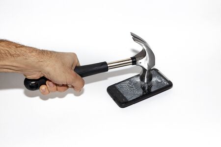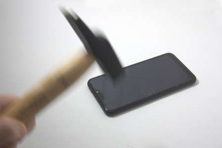 Hammer and smartphone. The screen of the smartphone, a broken hammer. The destruction of the phone.