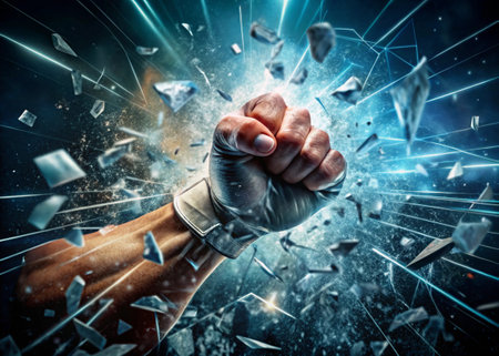 A powerful fist forcefully surges upward, shattering a delicate powdery layer, symbolizing strength, resilience, and breakthrough moments.