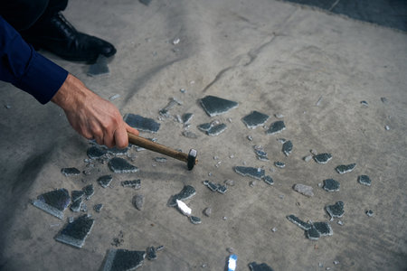 Man breaks triplex glass with a hammer