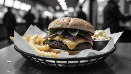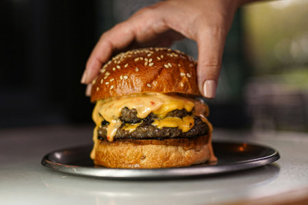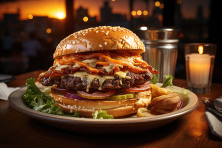 Realistic burger served in a cozy restaurant with neutral colors warm lighting high detail and a deserted atmosphere captured in a wideangle shot. Generative AI Generated