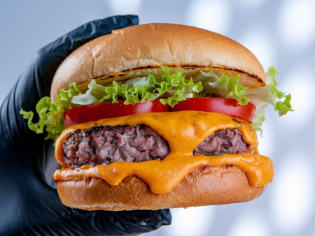 Gloved hand holding a delicious cheeseburger.