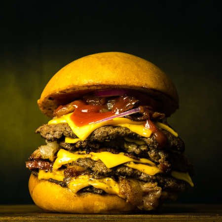 Delicious multi layered burger on dark slate with red background