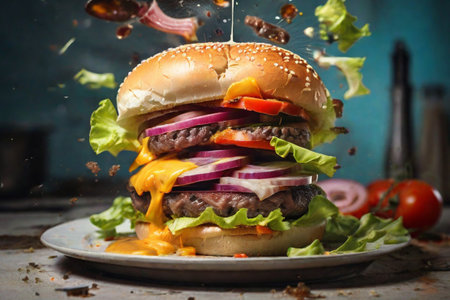 Delicious fresh cheeseburger on blue background. Tasty American cuisine, fast food promo with flying ingredients. Delicious burger with meat, tomato, lettuce, cheese. onion and ban