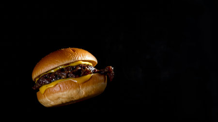 Detail of fresh tasty beef cheeseburger with melted cheese isolated on black background