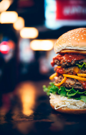 Hamburger on the street at night, close-up.