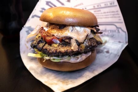 Fresh burger on paper. Close up photo.