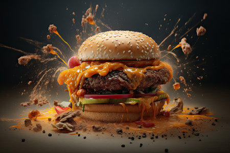 AI Generated. Juicy bacon cheeseburger splash studio shot