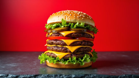 Gigantic hamburger showcasing its towering size against a vibrant red background, a feast for hungry eyes