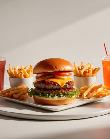 AI Generated. Hearty Burger with Fries and Refreshing Drinks