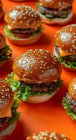 Wallpaper with a bunch of burgers on an orange background.