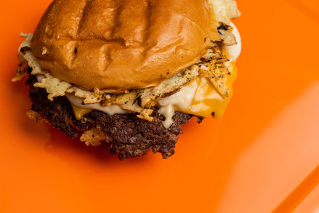 Close up of a cheeseburger on an orange plate with copy space