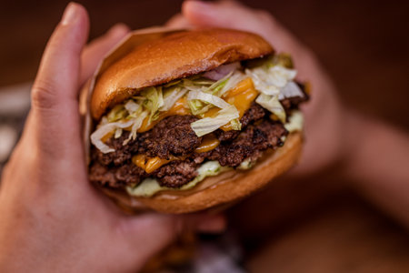 Two hands holding a double cheeseburger as it is about to be enjoyed by the customer.