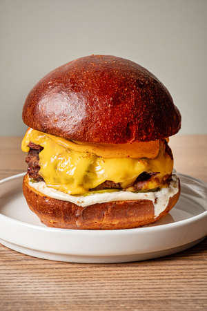 Juicy burger with beef cheddar jalapeos on wood backdrop