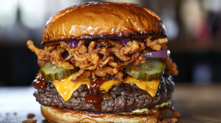 A mouthwatering burger featuring a juicy beef patty, melted cheese, crispy onion rings, fresh pickles, and a smoky barbecue sauce served on a soft bun.