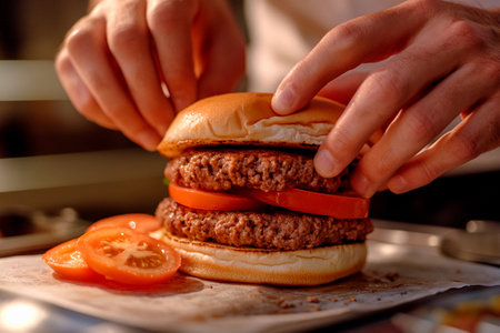 Hands carefully assemble a delicious burger with two beef patties, fresh tomato slices, and a soft bun. The atmosphere is warm and inviting in a home kitchen.