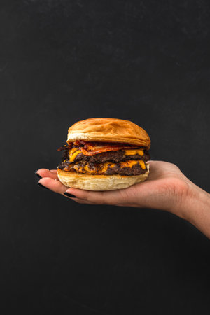 A vertical shot of a hand holding a juicy burger with cheese and bacon on a black background