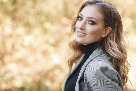 happy woman in black and white jacket looking aside near gray wall, banner