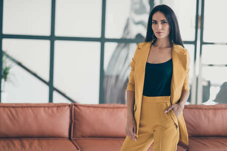 Gorgeous executive manager girl start work as freelancer in home house like office feel calm strict serious wear formal wear luxurious outfit indoors