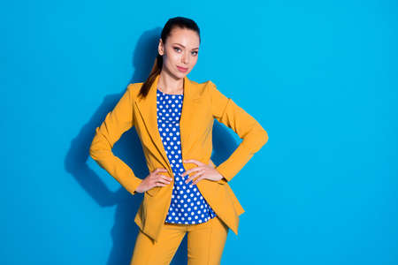 Portrait of her she nice-looking attractive lovely pretty charming chic classy elegant content lady cool look posing isolated over bright vivid shine vibrant blue color background