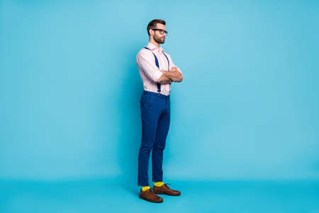 Ful body profile photo of handsome business man trend outfit eyesight vision specs arms crossed look empty space wear shirt suspenders pants footwear isolated pastel blue color background
