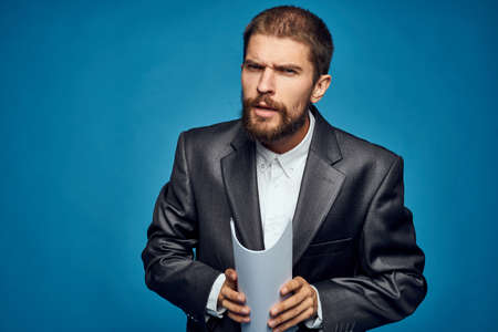 man in a black jacket with papers on a blue background.