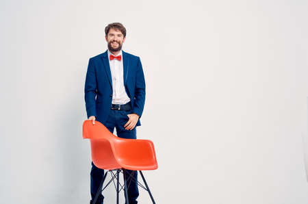 bearded man in suit sitting on red chair posing Professional