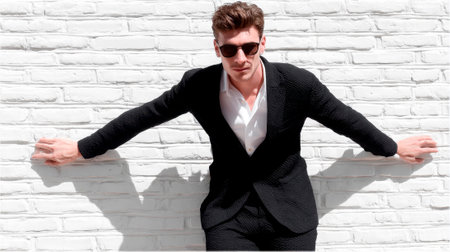 Handsome man in black shirt standing against white brick wall