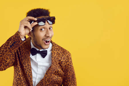 Happy positive handsome black man in funky leopard outfit, bowtie and sunglasses smiling and looking at camera with cheerful face expression isolated on yellow color text copyspace studio background