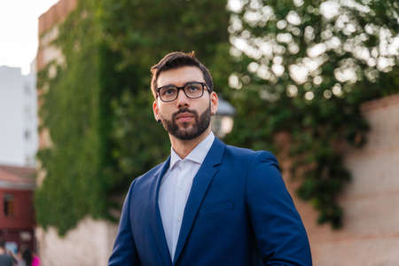 Portrait of serious fashionable handsome man in blue suit.