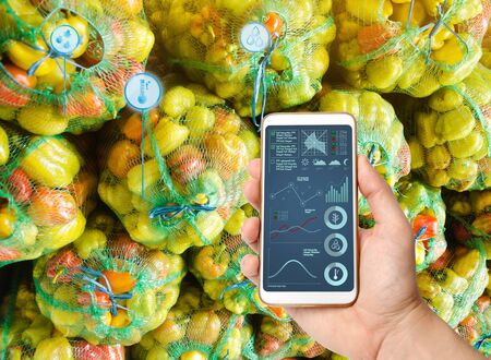 Farmer hold a smartphone on a background of a bags with a pepper. Agricultural startup. Automation and crop quality improvement. High technology, innovation. Scientific research.
