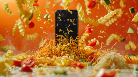 A dynamic and creative image of a smartphone surrounded by flying pasta and vegetables, representing technology and culinary arts.