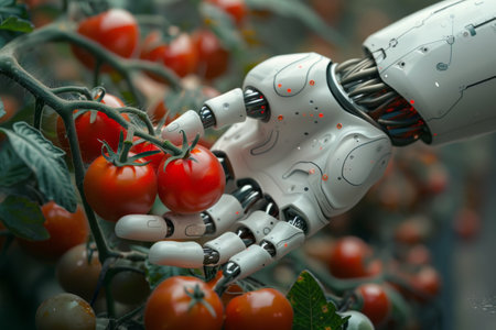 A precision robot arm picks fresh tomatoes with care in a controlled environment.