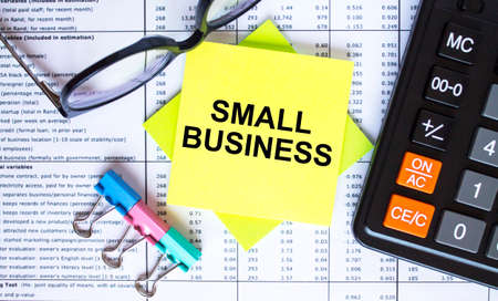 Text Small Business on yellow stickers with calculator, eyeglasses and paper clips. Business and financial concept