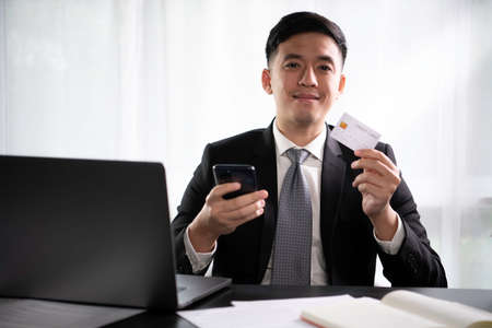 Smart young Asian businessman sitting at home office with laptop smiling and happy while using credit card with online shopping mobile application on smartphone. Young Asian entrepreneur looking confident and satisfied with digital online payment transaction in business.
