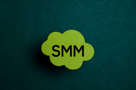 Black cubes with abbreviation SMM (Social media marketing) on gray background. Space for text