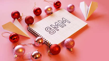 The inscription SMM in a notebook on a pink festive background. Red and pink Christmas balls, paper planes around