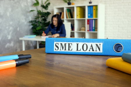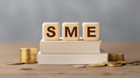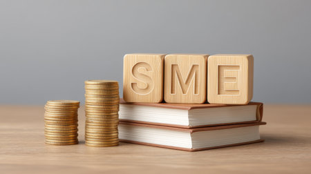 A creative representation of small medium enterprises featuring wooden blocks with SME letters atop stack of books, accompanied by gold coins symbolizing financial success.